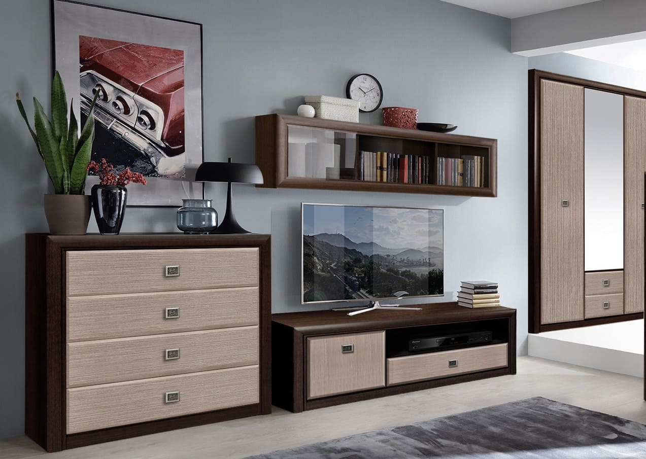 У меня в квартире гостиная совмещенная со столовой, хотелось как-то их разграничить удачно не только цветом стен, но и мебелью. Этот модульный комплект мне понравился прежде всего своим аккуратным дизайном и приятными цветами. Оттенки очень теплые и уютные. С комодом и тумбой этого набора у меня получилась очень симпатичная гостиная, так что покупкой я очень довольна!