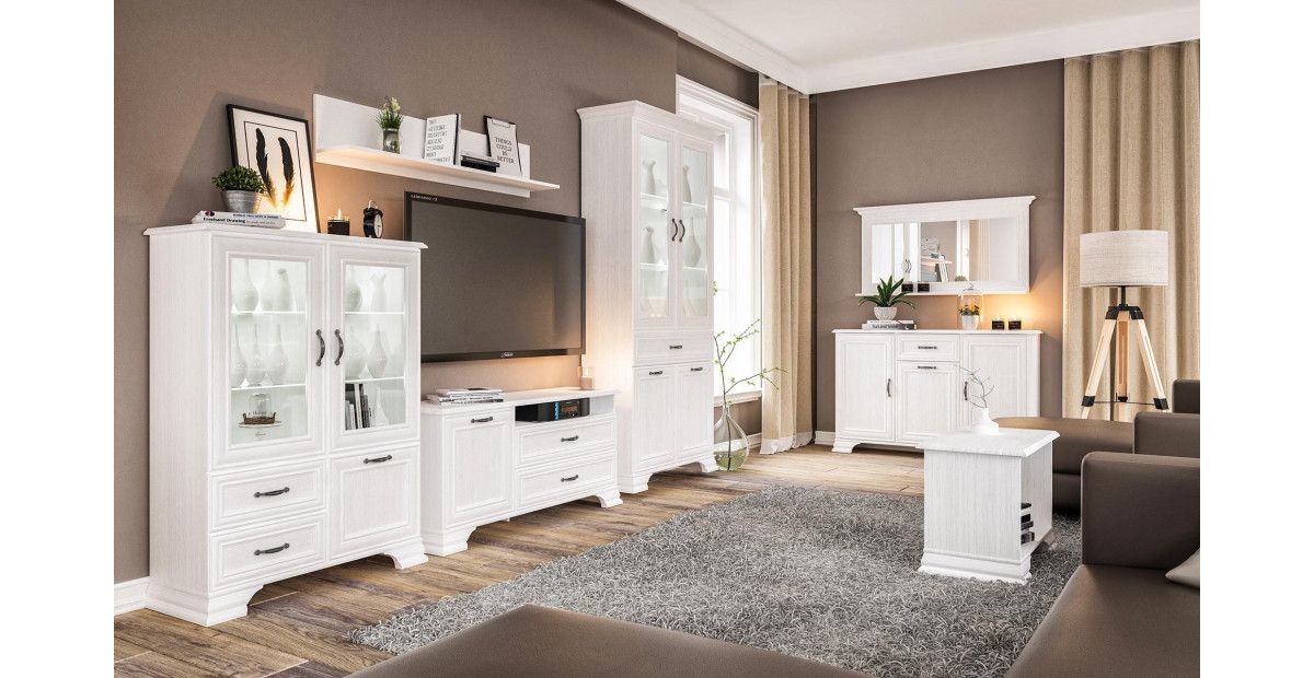 Гостиная Юнона 2 от фабрики Мебель-Неман в классическом стиле с отделкой структурной фактуры, обрамленная рамочным фасадом, где металлические ручки выгодно подчёркивают стиль и изящество, всегда актуальна и востребована. Полки у шкафа-витрины и тумбы - стеклянные.