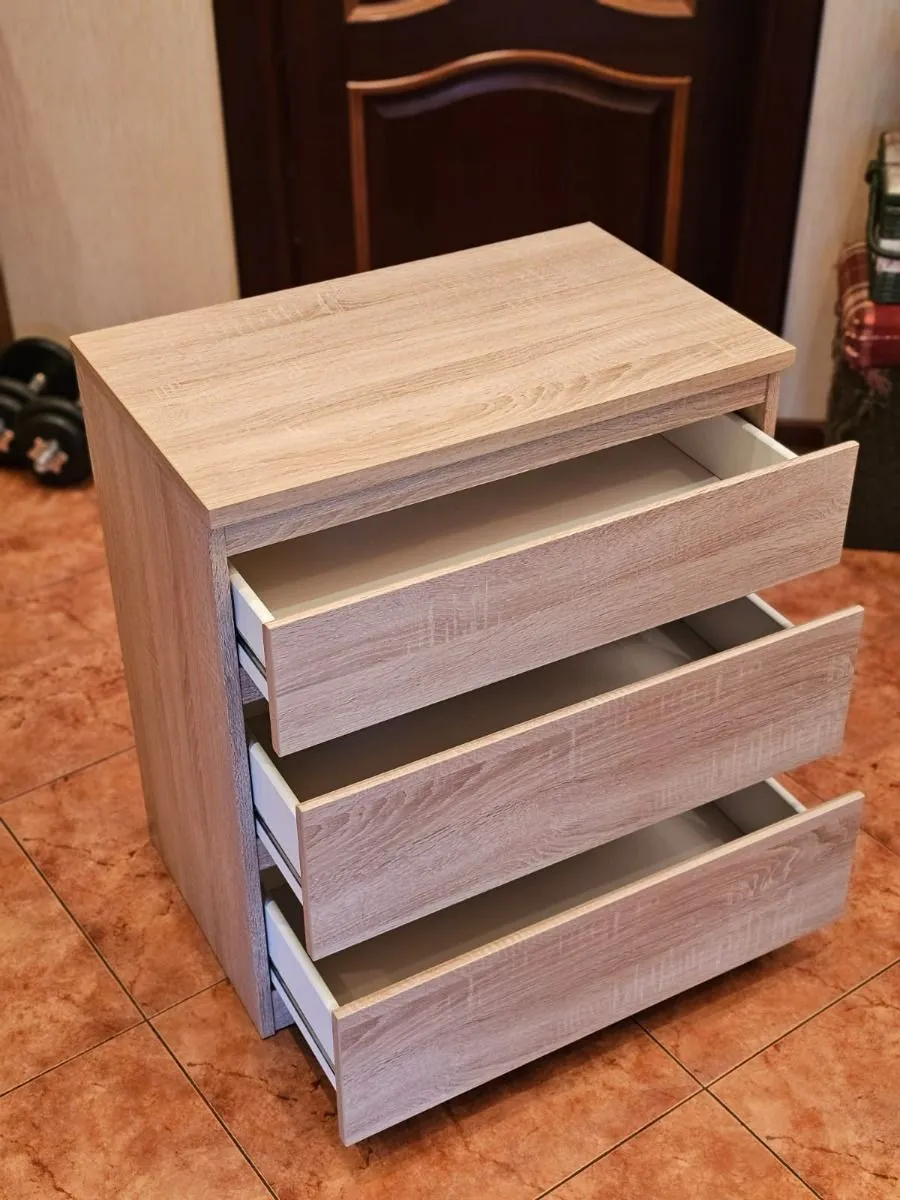 Комод КАСТОР с тремя наружными выдвижными ящиками, 650х396х716, цвет Дуб Сонома. Изготовлен из кашированного ДСП толщиной 16 мм. Крепится к стене. Гарантийный срок для жилых помещений 24 месяца, для общественных помещений - 18 месяцев.