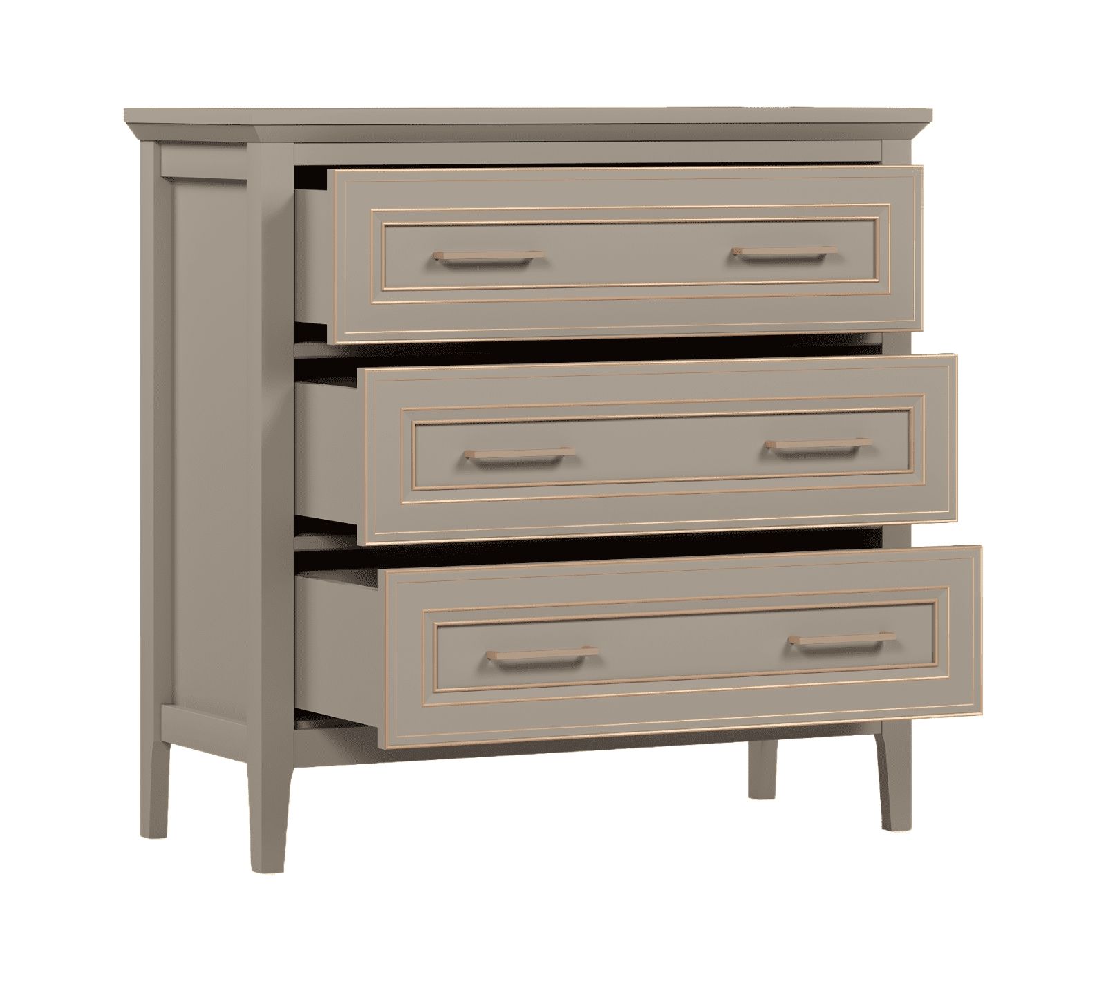 Комод Classic KOM3S на высоких ножках – незаменимый атрибут классического интерьера. От этого стиля он унаследовал серый цвет с глиняным оттенком, правильную форму и декор позолотой. Главными элементами конструкции являются выдвижные ящики на шариковых направляющих. За счет плавного хода они не громыхают и медленно докатываются до начального положения.
