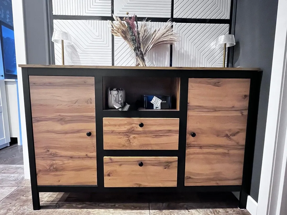 Широкая тумба Loft объединяет функцию хранения и декора. Она состоит их двух распашных дверей, двух ящиков и одного открытого отделения. Корпус изготовлен из древесно-стружечной плиты класса Е1 и МДФ. Поверхность тумбочки оклеена ламинированной пленкой под дуб вотан, ножки представлены в черном цвете. По всему периметру проходит темная окантовка. Такое контрастное сочетание – характерная черта коллекции и интерьерного стиля лофт.