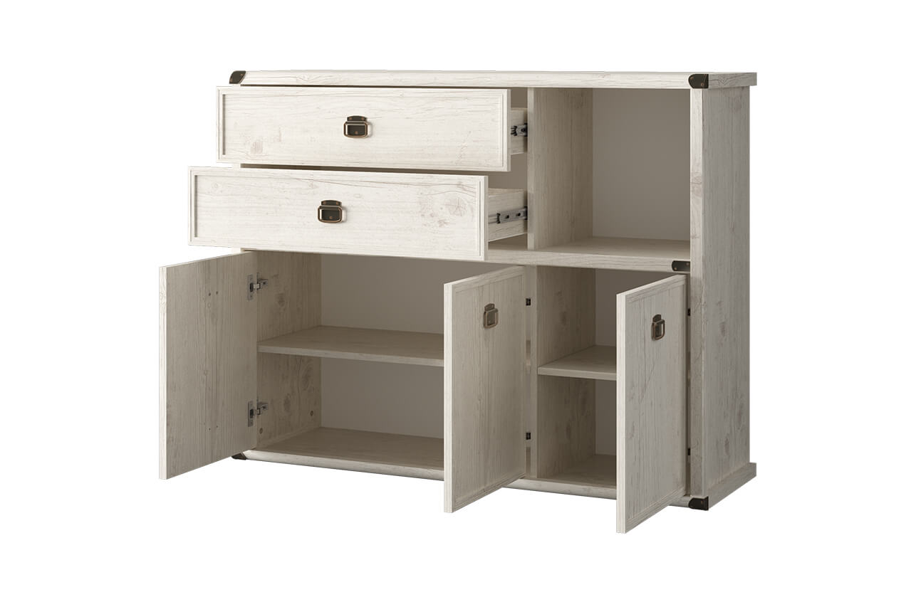 Оригинальная конструкция из открытых и закрытых элементов – ключевая особенность белорусской тумбы Magellan 3D2SN. В ней предусмотрены 2 секции для хранения. В двух верхних ящиках можно хранить мелкие предметы, на трех нижних полках – коробки и более крупные вещи. Открытое отделение позволит хранить книги и разные бытовые аксессуары. В ее верхней части достаточно места для предметов декора и сувениров, привезенных из путешествий.