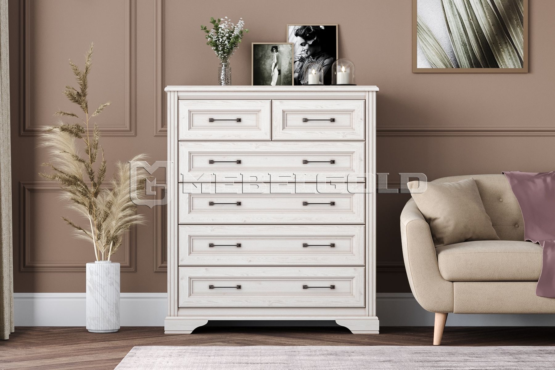 Комод Stylius высотой 121 см и шириной 103 см впишется в пространство небольшой гостиной, спальни, детской и кабинета. Он укомплектован шестью выдвижными ящиками на шариковых направляющих. Их нижняя часть укреплена металлическими профилями от провисания. Для защиты от опрокидывания производитель укомплектовал заднюю стенку специальной страховочной лентой.