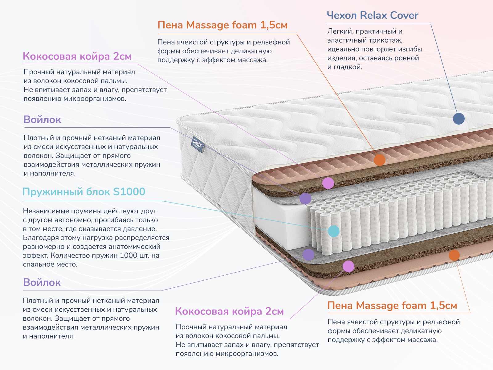 Для матраса предусмотрен специальный массажный чехол, пошитый на основе трикотажа. Ткань простёгивается по рельефному слою пенополиуретана.