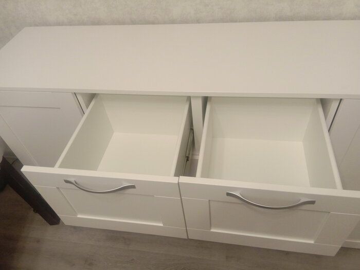 качественая склейка швов. инструкция по сборке-шикарна. все как дл Икеи!. я купила ручки белые, они идеально вписались в стиль помода. Производителям рекомендую пересмотреть фурнитуру. ручки подойдут под размер 128 мм(мне они обошлись около 1700). В целом, тумба, за свои деньги-отличная.