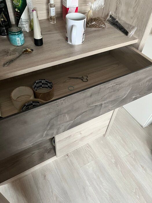 Шкаф JAZZ 3D1SN демонстрирует необычную комбинацию открытых и закрытых отделений. Вверху и в середине оборудованы открытые секции, в середине и внизу установлено два дополнительных отделения с откидной и распашной дверцей. Оригинальность модели с цветом фасадов каштан наироби придает декоративная вставка на ящике с оттенком оникс. Модель с такой отделкой смотрится гармонично и не броско.