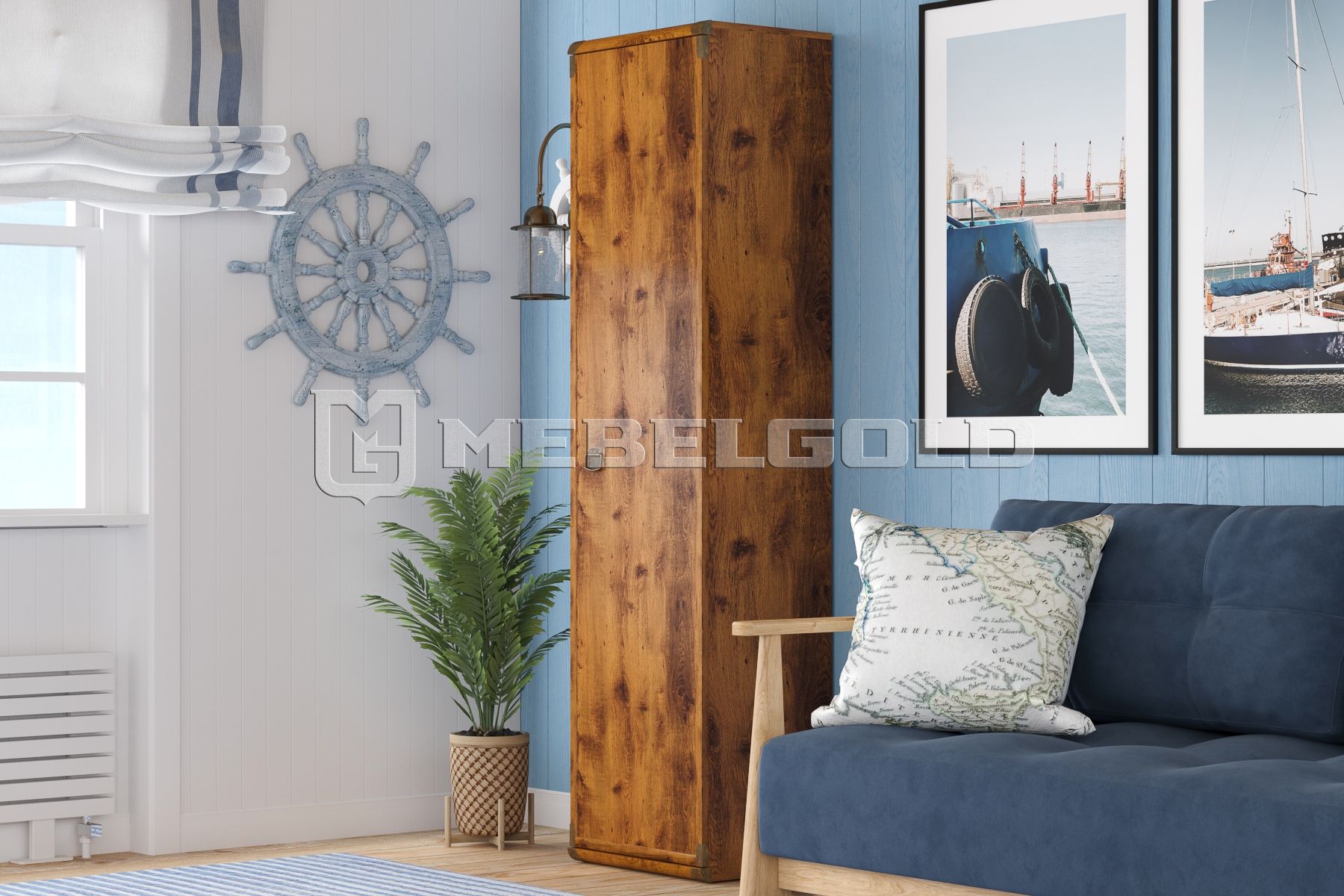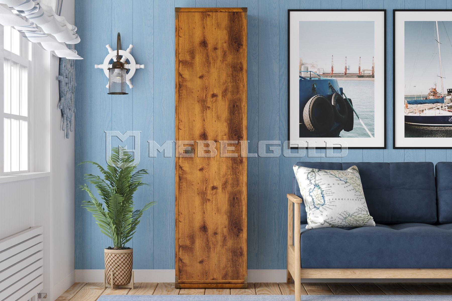 Высокий одностворчатый шкаф Indiana представлен в цвете дуб саттер. Его фасады насыщенного коричневого цвета дополнены металлическими накладками на углах и латунными ручками по типу подковы. Модель в такой отделке является приоритетным вариантом для классических интерьеров и комнат, оформленных в стиле кантри. Ее можно установить в детской, гостиной или домашней библиотеке. Мини-шкаф легко впишется в узкое пространство и эффективно решит поставленные задачи.