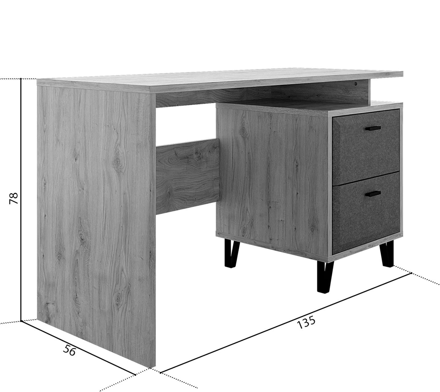 Столешница удлиненной формы имеет ширину 134 см и глубину – 55 см. Это позволит успешно разместить на ней ноутбук, канцелярию и необходимые рабочие материалы. Модель изготовлена из ламинированной плиты ДСП и МДФ, которая с максимальной точностью передает красивый древесный рисунок под дуб наварро и окрашивает ящики в насыщенный графитовый цвет. Установленные в них шариковые направляющие Quadrо упростят их открывание и закрывание, а также продлят срок службы мебели.