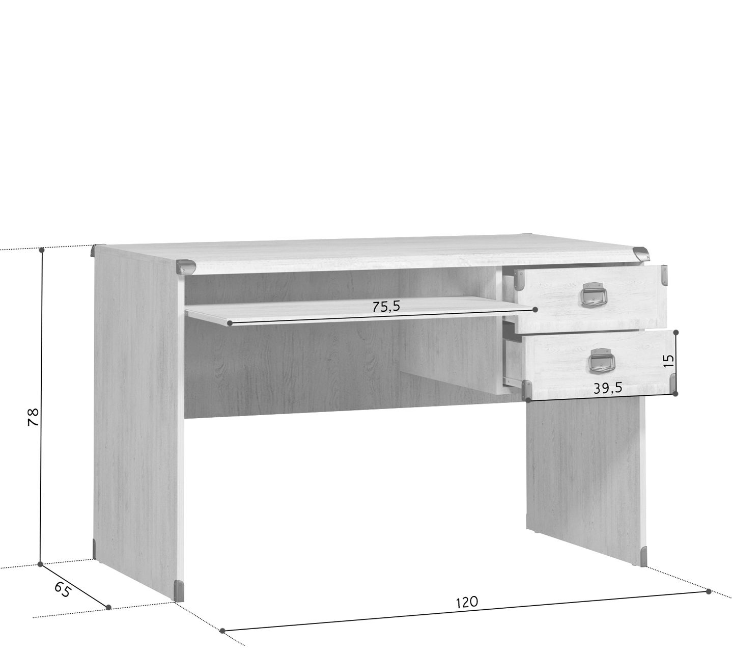 Письменный стол Indiana размером 120×65 см – это решение для тех, кто планирует на небольшом пространстве обустроить полноценный рабочий уголок. Он состоит из устойчивого каркаса, двух небольших ящиков 39×15 см и отделения для клавиатуры длиной 75 см. По обеим сторонам установлены широкие боковины, придающие изделию устойчивость и законченный вид.
