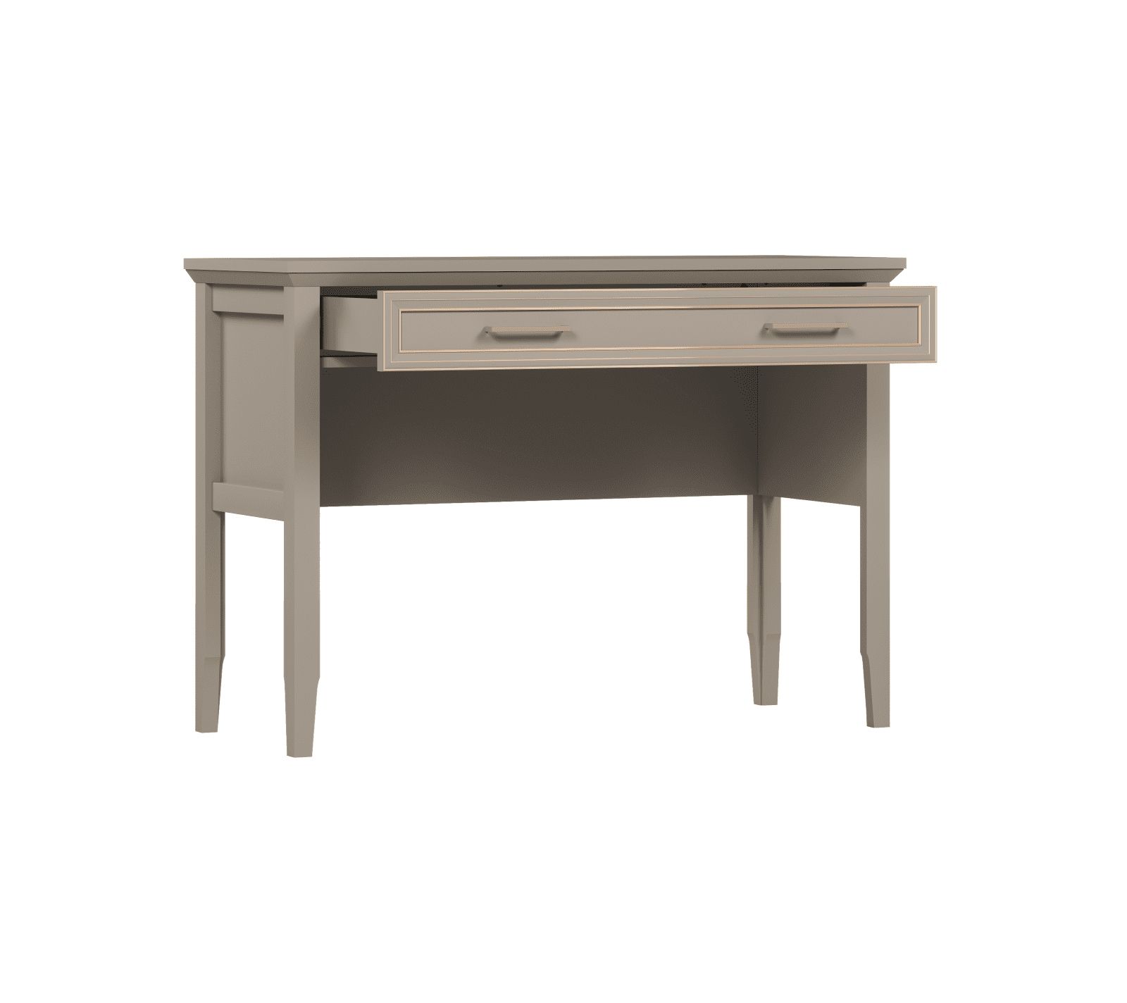 Туалетный стол коллекции Classic – разработка белорусского бренда БРВ-мебель. Он представлен простой конструкцией на четырех конусообразных ножках. Модель оформлена в классических традициях и сочетает простоту с элегантностью. Такой столик привлекает незамысловатым дизайном и глиняно-серым цветом с бесконечными теплыми нотками. Ярким и выразительным он становится благодаря золотистой окантовке, украшающей ящик по всему периметру.