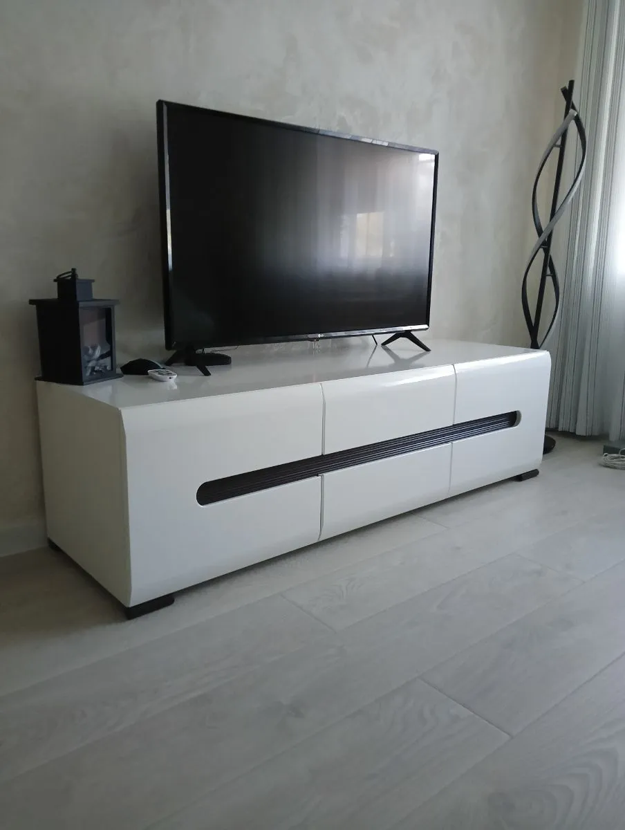 Белая тумба Azteca станет яркой доминантой интерьера и сделает комнату еще светлее. За счет универсального дизайна она легко впишется в любой тип помещения, а пластиковые ножки придадут ей дополнительную устойчивость и лаконичный вид. Тумбочка шириной 150 см подходит для установки телевизора любой диагонали, а также размещения аудиосистемы и предметов декора. Она визуально подчеркнет зону ТВ и обратит на себя внимание идеальной геометрией.