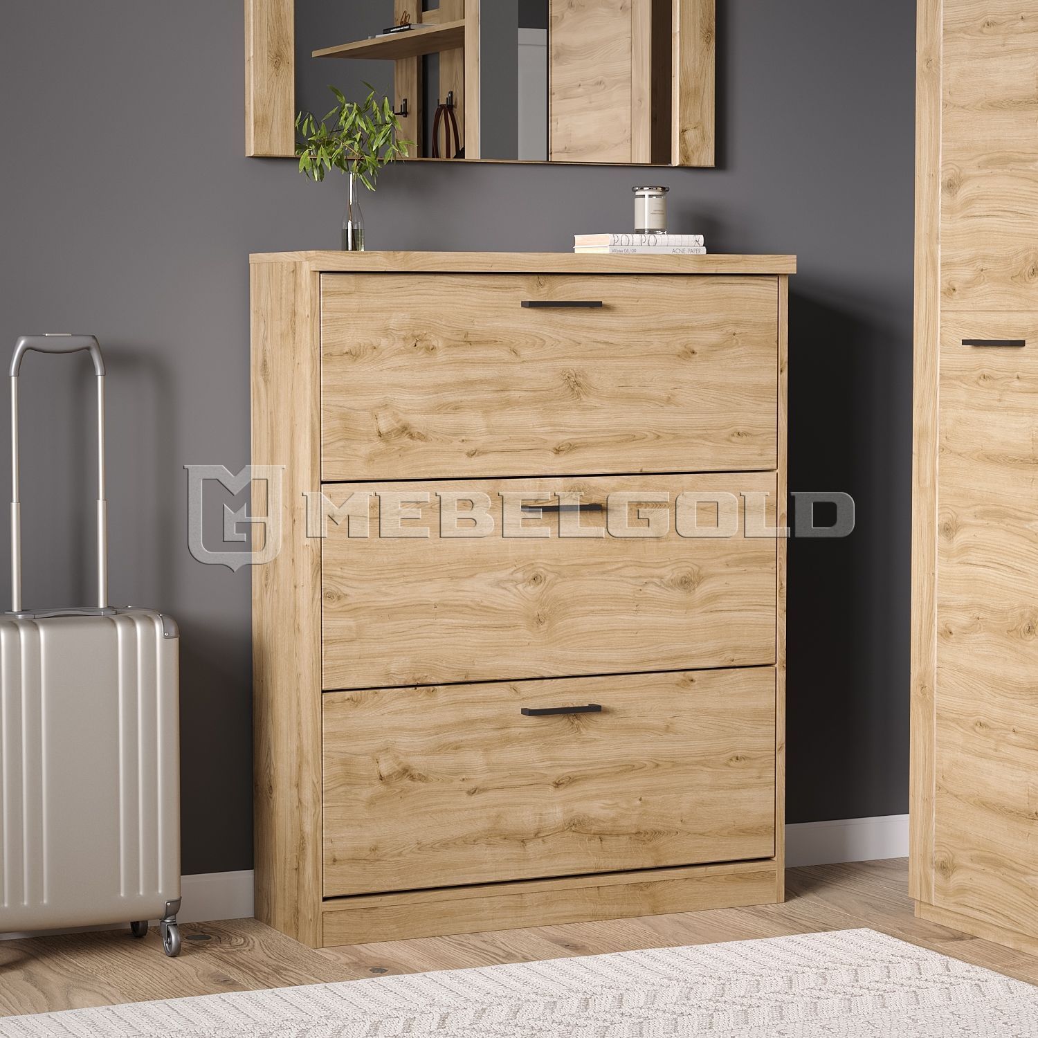 Небольшая тумба для обуви Doorset 3D со светлыми фасадами в цвете дуб наварра вписывается в прихожие скандинавского и современного стиля. Ее гладкая поверхность не притягивает пыль и легко очищается от загрязнений. Это вариант для тех, кто ищет практичные и стильные обувницы без навязчивого декора.