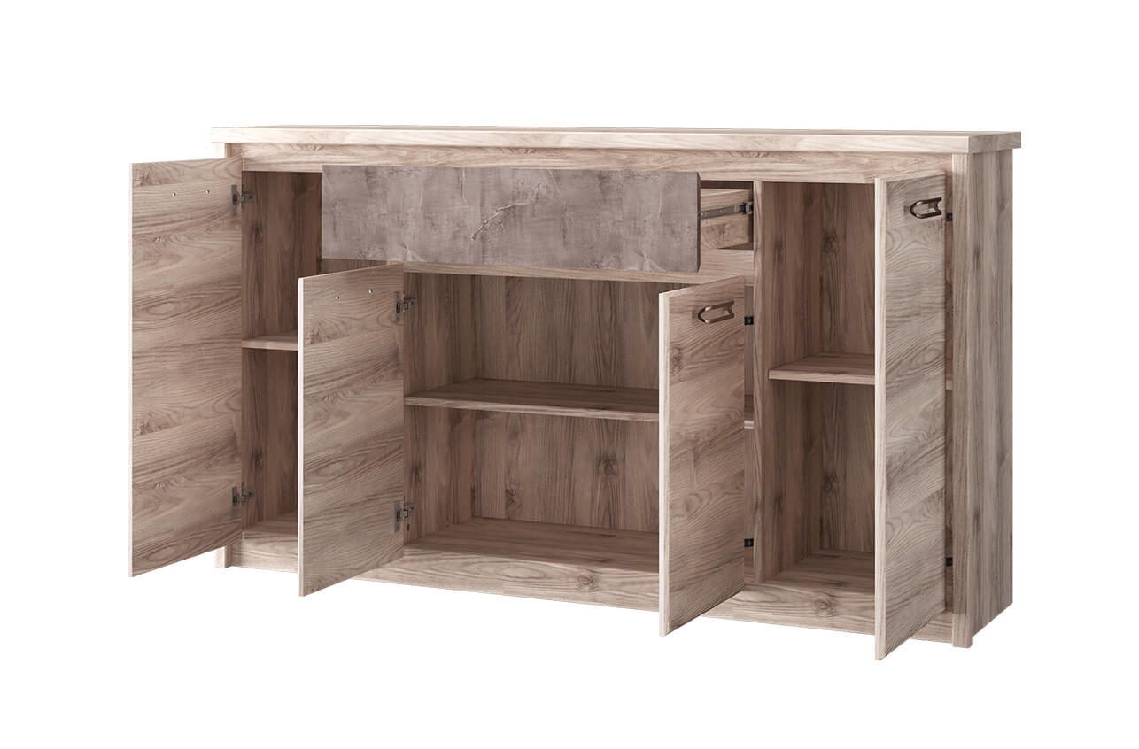 Широкая напольная тумба JAZZ 4D1S из ЛДСП имеет вид эксклюзивной мебели, сделанной из дерева. Естественность ей придает ламинированное покрытие, имитирующее узоры натуральных волокон. Прямая тумба «Джаз» подходит для наполнения спален и прихожих стиля модерн, минимализм, хай-тек.