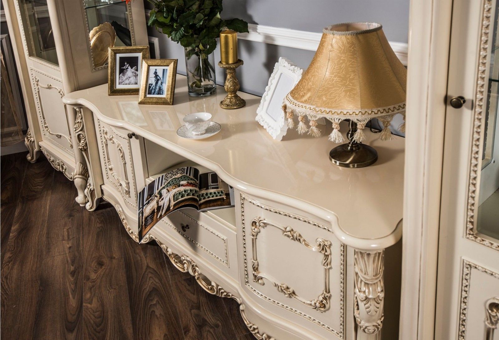 Элегантные фасады ТВ тумбы «Джоконда» в нежном цвете крем приковывают внимание золочеными узорами и симметричным расположением декора. Красивый глянцевый отлив добавляет еще большей выразительности и делает ярким предметом интерьера. По-настоящему аристократичный вид и визуальную легкость этой модели придают изогнутые ножки. На светлом фоне сверкающая позолота выглядит дорого и смело.