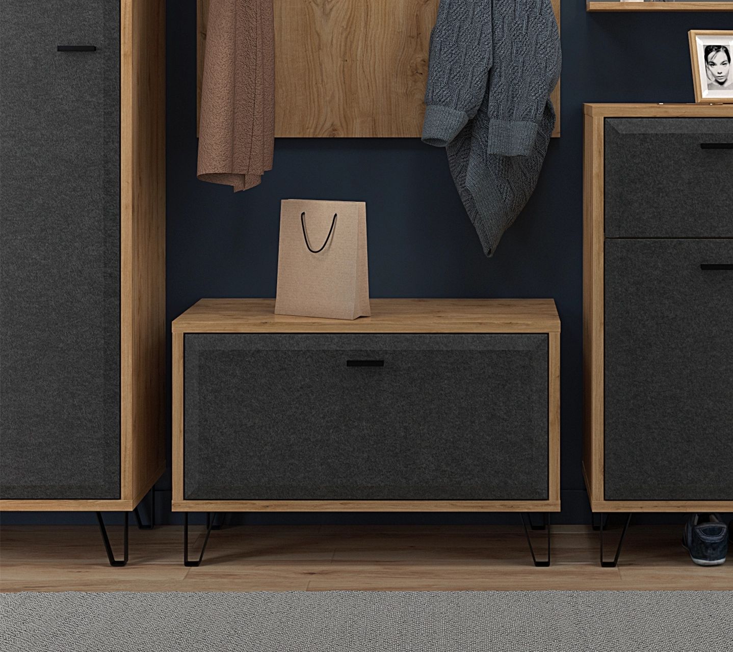 Просто и со вкусом – так отзываются о тумбе для обуви Grace все, кто пользовался ей хотя бы один день. Она состоит из откидной дверцы и просторного внутреннего отделения. Модель такой комплектации позволяет хранить как высокие сапоги, так и низкие ботинки. Ее внутреннее пространство высотой 50 см и шириной 79 см легко умещает коробки с обувью и средства по уходу.