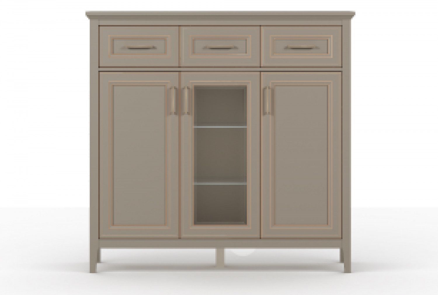 Идеальная симметрия и четкое сочетание элементов делает тумбу-витрину Classic KOM1W2D3S узнаваемым предметом интерьера. Три распашных дверцы в ней точно расположены над выдвижными ящиками, что создает гармонию. Сама модель смотрится сбалансировано и компактно за счет небольших размеров, ширины 136 см и высоты 133 см. По бокам установлены глухие двери, а в центре прозрачная створка со стеклянными полками.