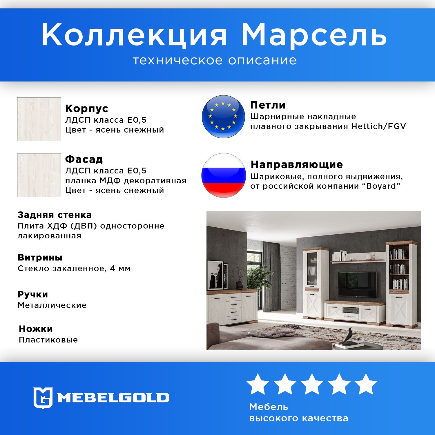 • Тумба разделена на 4 отделения: 2 отделения с полками за распашными дверями со стеклянной вставкой, отделение в центральной части за откидной дверью, 3 выдвижных ящика на металлических роликовых направляющих;