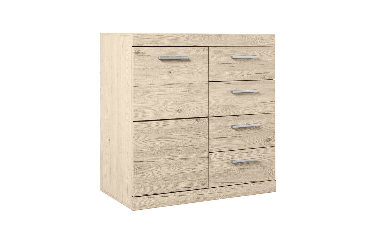 Тумба Oskar 1D4S ‑ это внешне компактная, но вместительная конструкция со стандартной шириной 80 см и глубиной 40 см. Высота составляет 81 см, что позволяет отнести ее к низким моделям. Такая модель удобна для постоянного использования: из нее легко доставать вещи даже из самых дальних углов.
