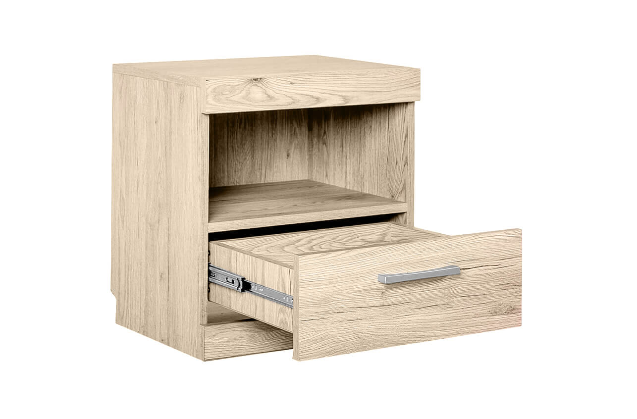 Прикроватная тумба Oskar 1S оснащена надежной польской фурнитурой SCHWINN: пластиковыми серебристыми ручками и шариковыми направляющими полного выдвижения. Благодаря этим элементам, ящики двигаются плавно, без раздражающего скрипа и перекосов. Тумбочка подойдет для кроватей из коллекции «Оскар» и поможет создать в прикроватной зоне уютный уголок.