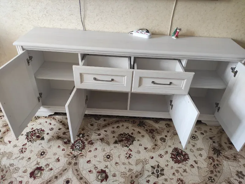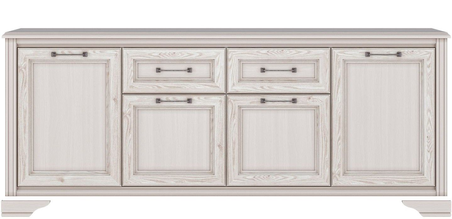 Модель укомплектована двумя выдвижными ящиками и четырьмя глухими дверцами. Это прекрасный вариант для узких гостиных и длинных детских комнат. Гармоничнее всего она смотрится у стены в комплекте с мебелью в аналогичном дизайне.