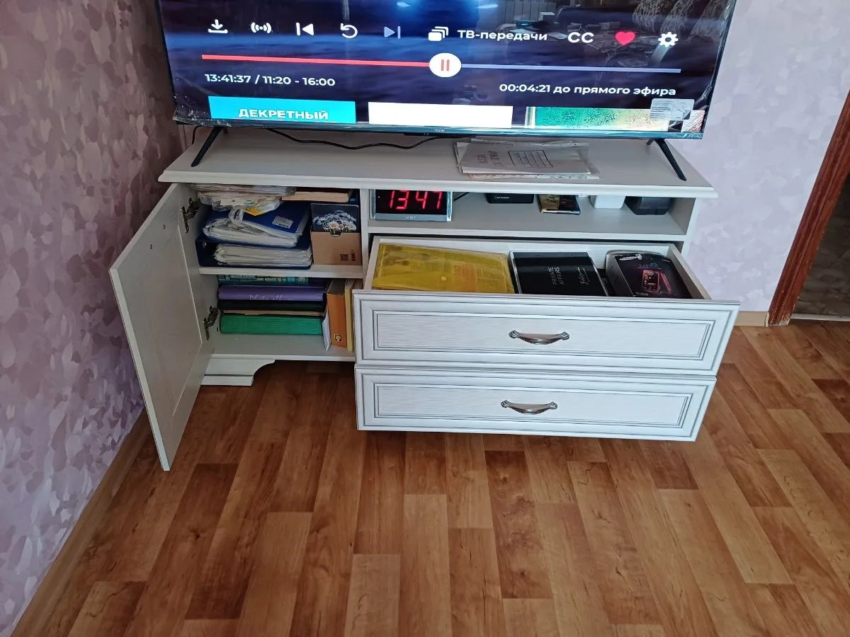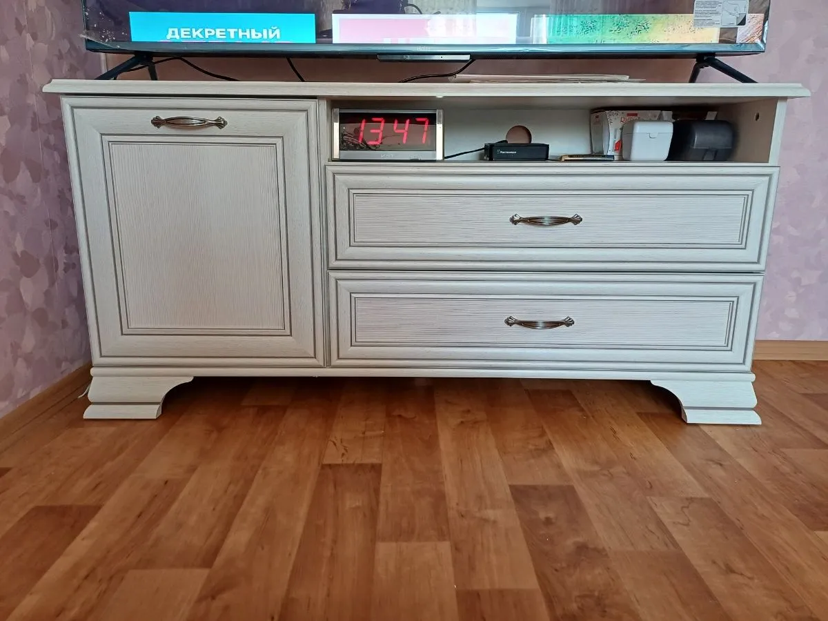 Корпус напольной тумбы RTV произведен из ЛДСП и оформлен декоративными планками из МДФ, ее ящики оборудованы надежной польской фурнитурой. При оформлении фасадов использован цвет, характерный для всей коллекции Tiffany, вудлайн кремовый. Этот нежный оттенок не только украшает мебель, но и делает интерьер более воздушным и мягким, как пирожное бизе. Ее матовая поверхность с продольными древесными прожилками смотрится очень эффектно и подходит к любой другой мебели светлых тонов.