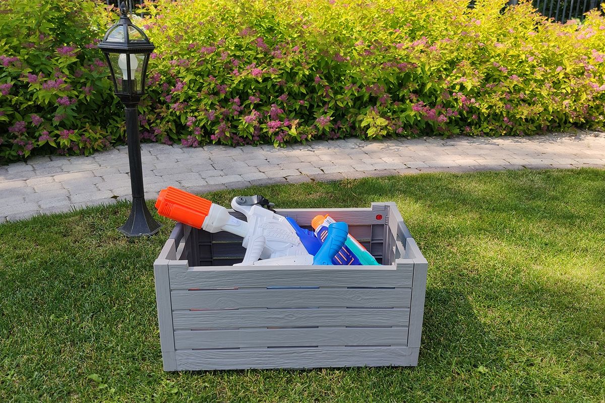 Прочный складной пластиковый ящик для сада с деревянной отделкой, резиновой ручкой и нескользящими ножками.